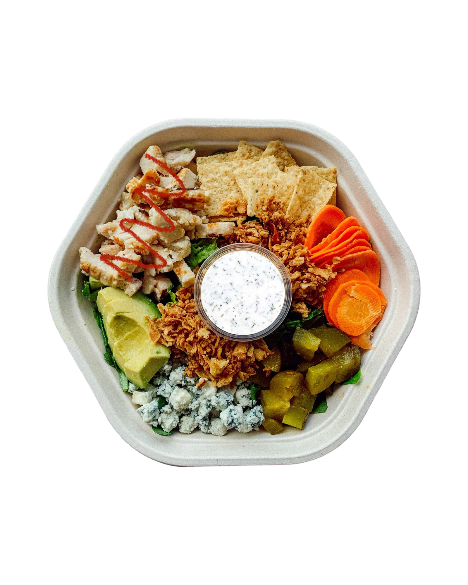 Grilled chicken, blue cheese, avocado, spicy pickles, carrot, fried onions, tortilla chips, romaine, hot sauce and ranch dressing.