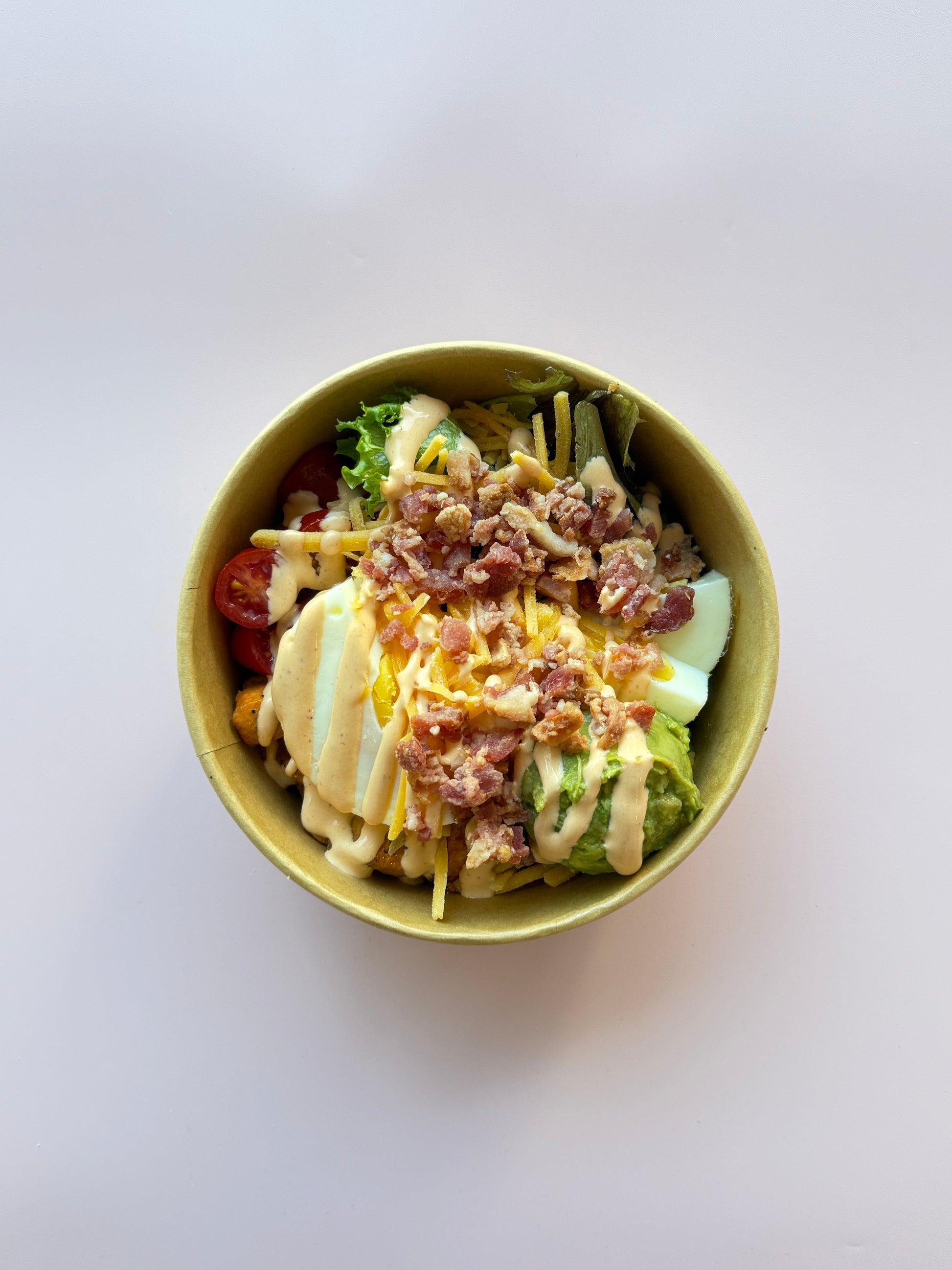 Two eggs, sweet potato, crumbled bacon, avocado, cheddar, tomato, greens, hot sauce, and chipotle caesar dressing.