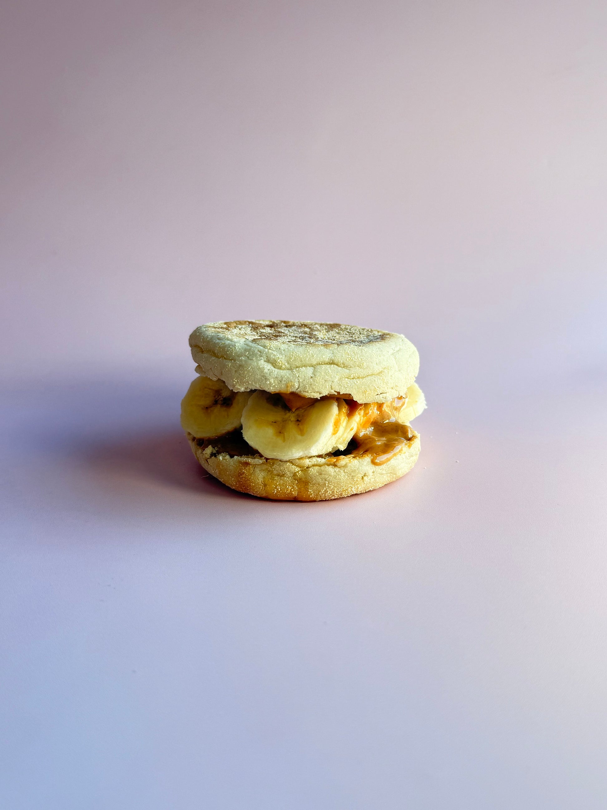 English muffin, honey, banana, cinnamon, and peanut butter.