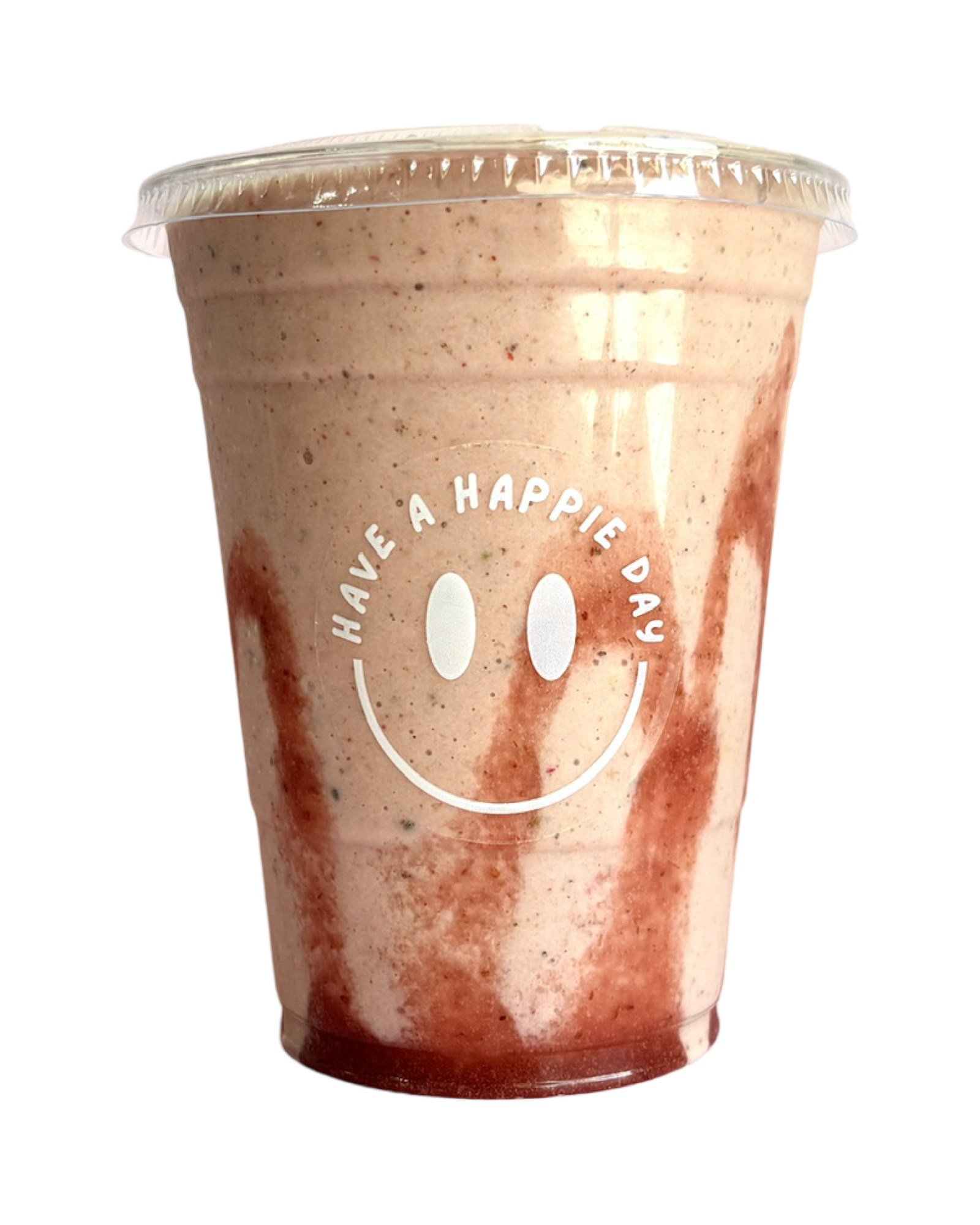 Strawberry, banana, chia seeds, strawberry jam, peanut butter, and house almond milk.