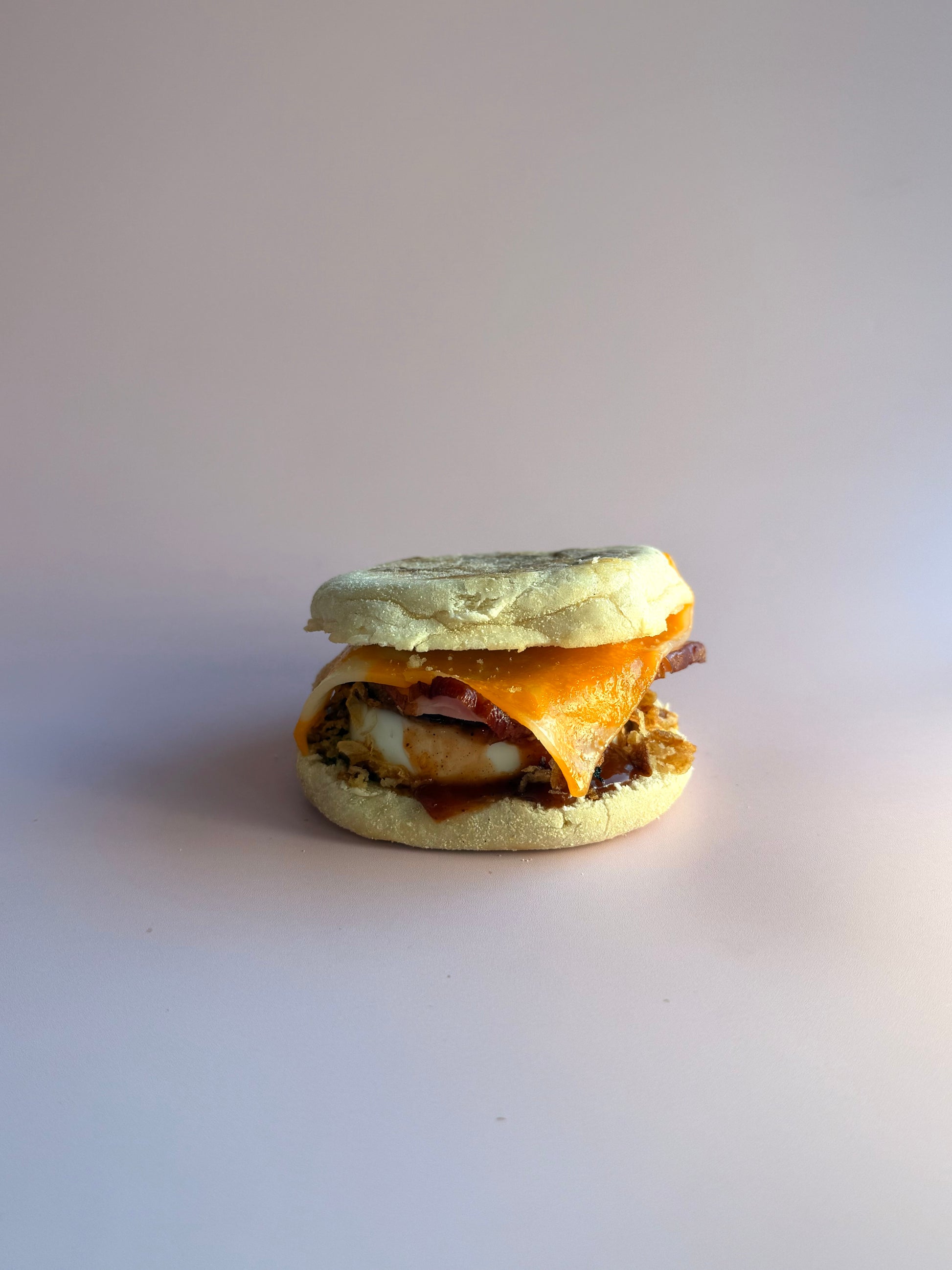 English muffin, egg, Canadian bacon, cheddar, fried onions, and bbq sauce.