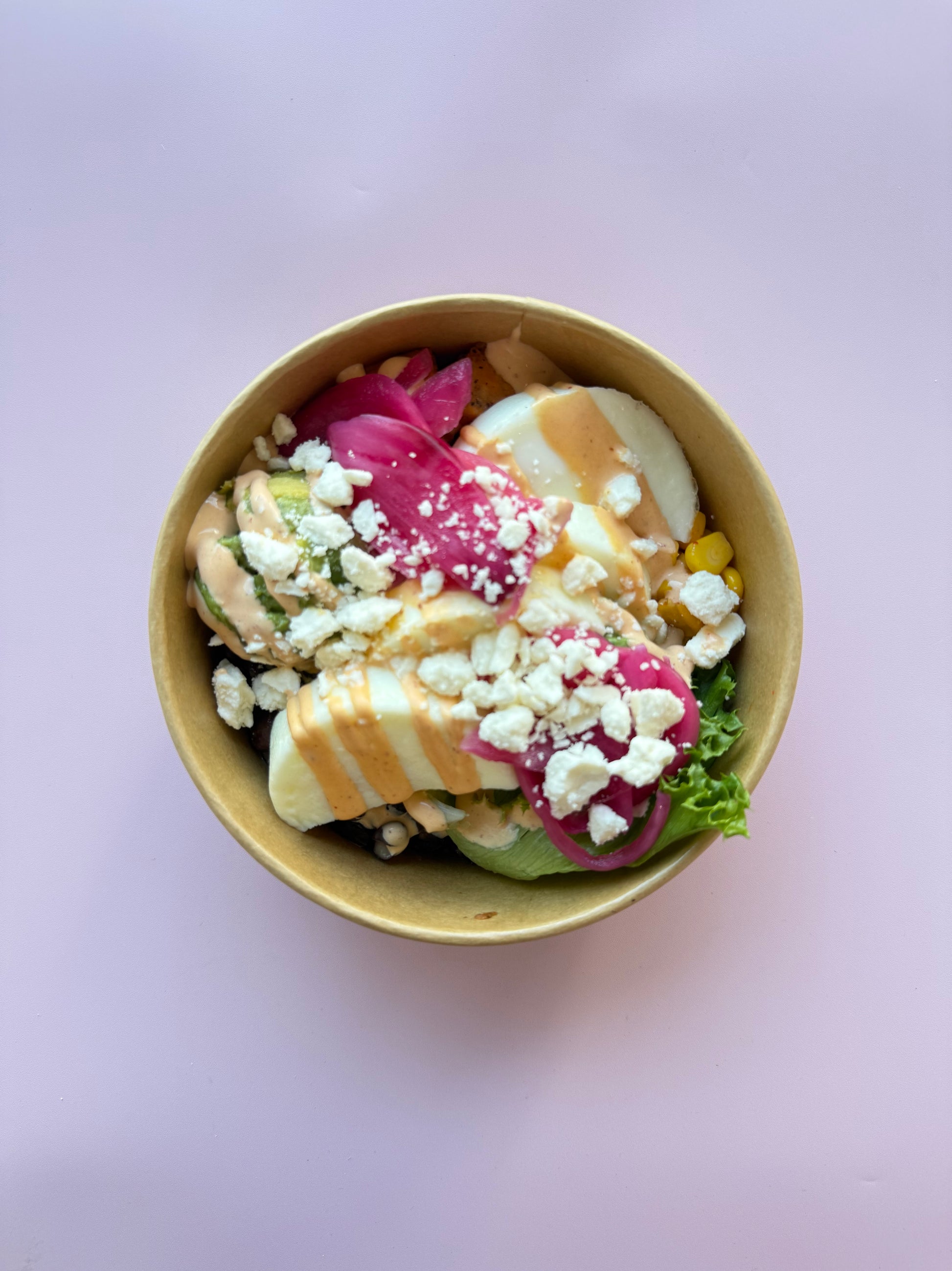 Two eggs, sweet potato, avocado, feta, corn, black beans, red onion, greens, and chipotle caesar dressing.