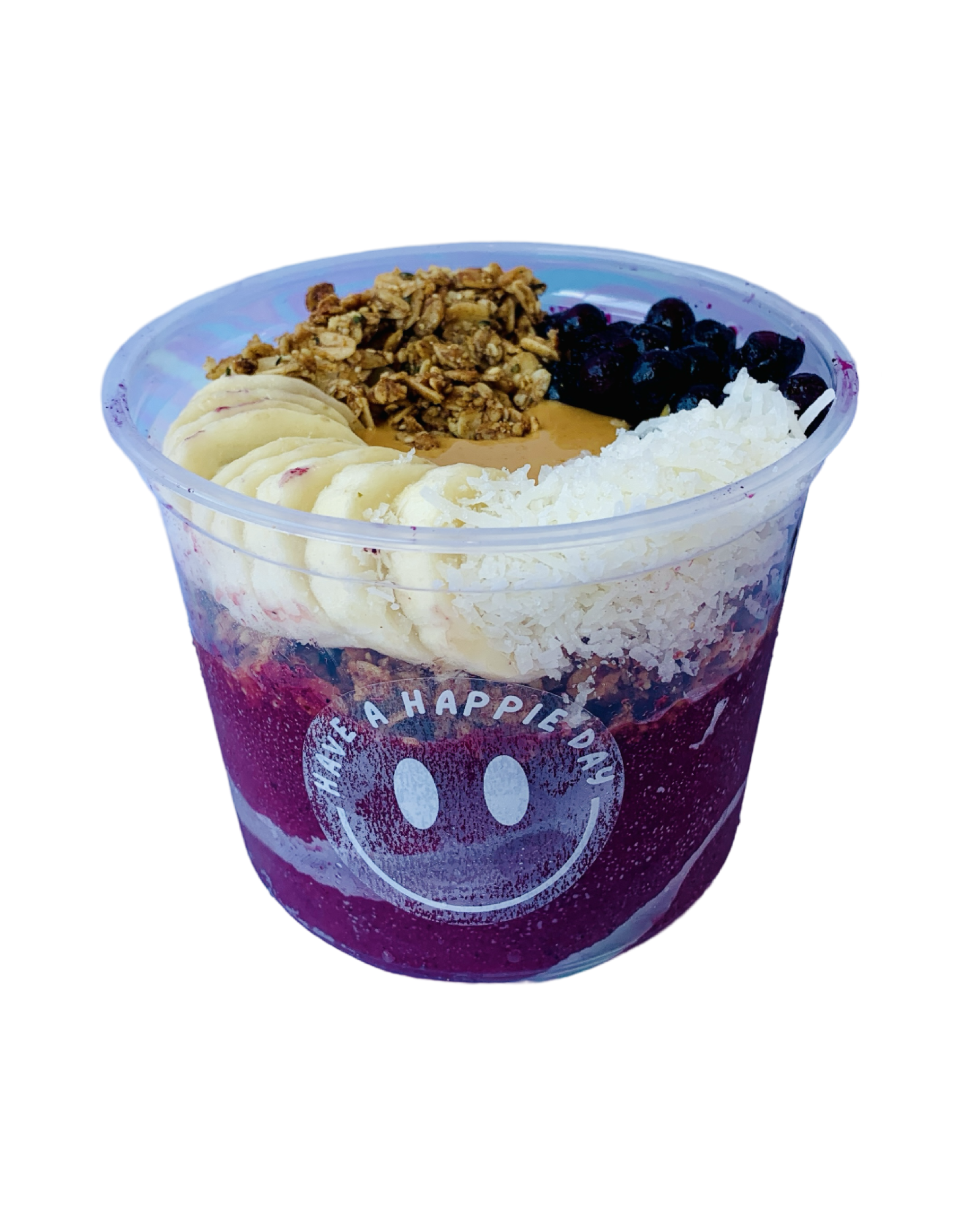 Acai base, banana, blueberry, coconut, granola (GF), and peanut butter.